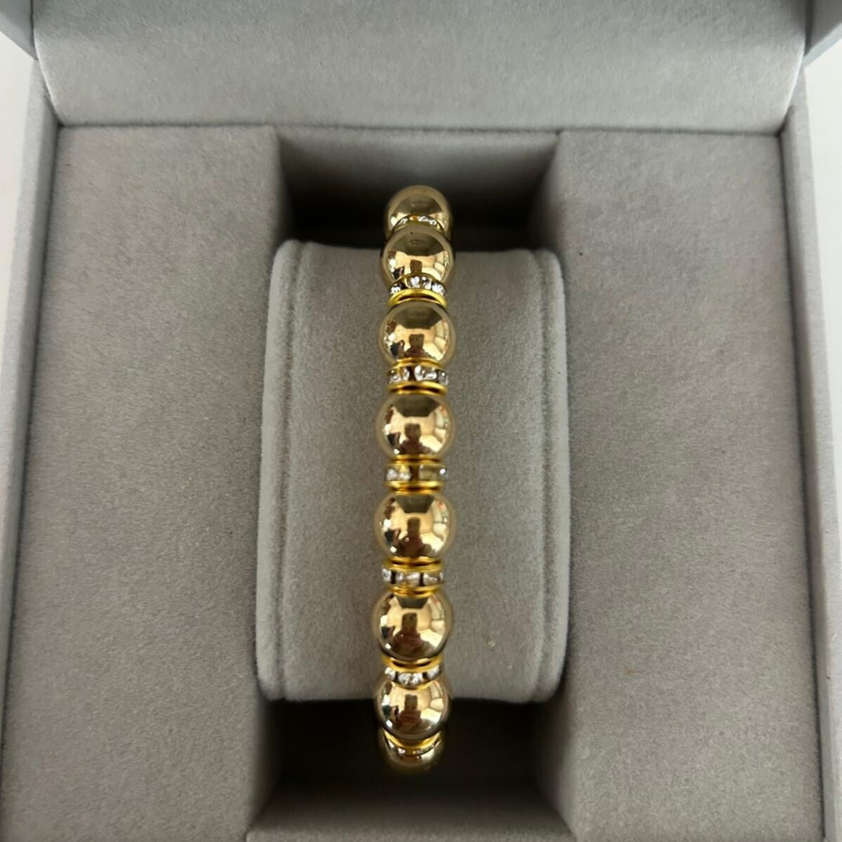 Acrylic and copper gold coloured beads with silver rhinestone spacers.