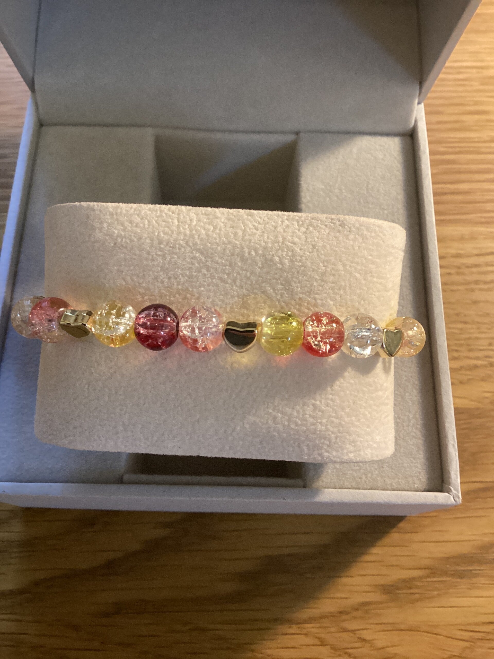 Mixed coloured glass beads with gold coloured alloy spacers.
